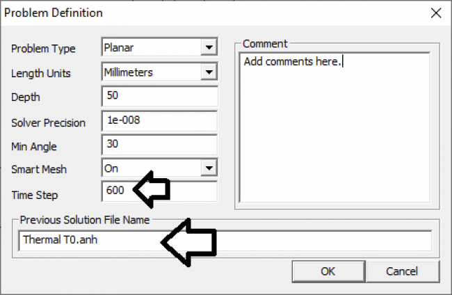 The “steady state” problem assumes that the thermal conditions exist for infinitely long time. This is achieved by leaving the field “Previous Solution File Name” empty.