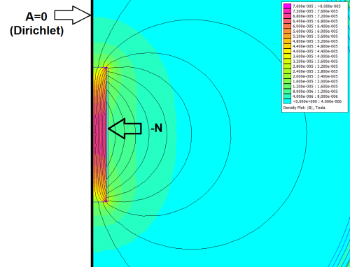 Neumann - the condition of dA/dn = 0 which means that the flux lines will be forced to cross this boundary at 90 deg angle. It can be though of as a perfect conductor.